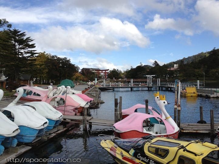 Looking back at the Torii (Gate) are the swan boats that are famous to ride in the summer >